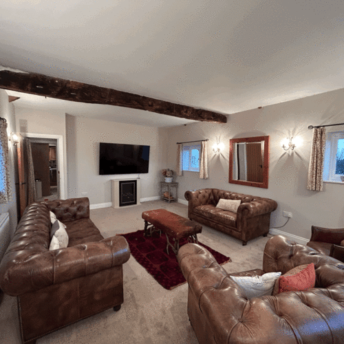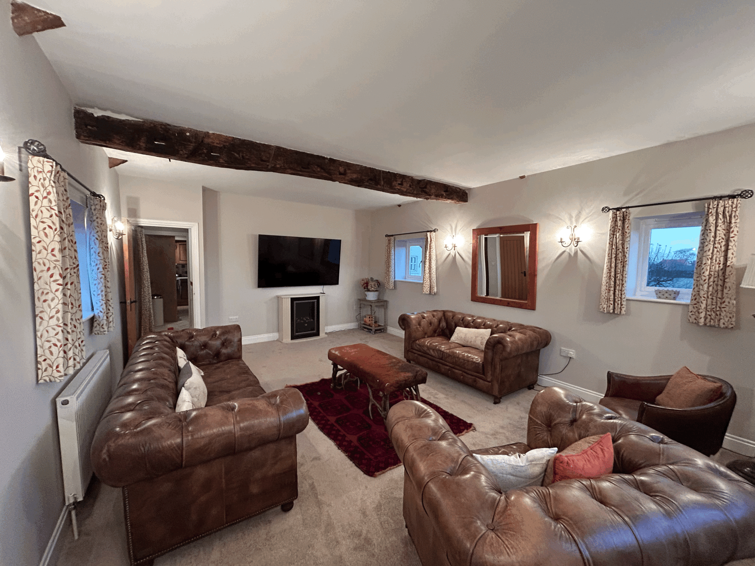 The property has breath taking views of the Yorkshire Dales & the land that's our family farm. The living room is finished with stylish chesterfield sofas and a television.